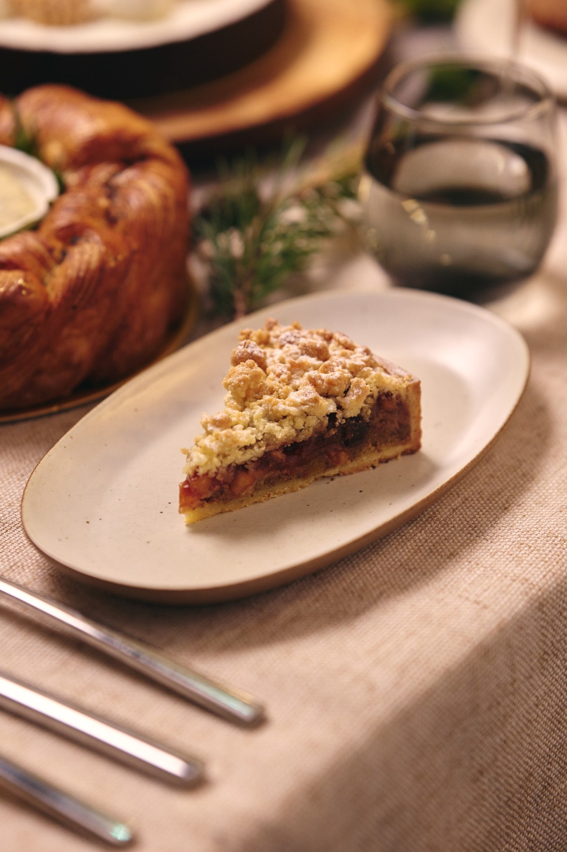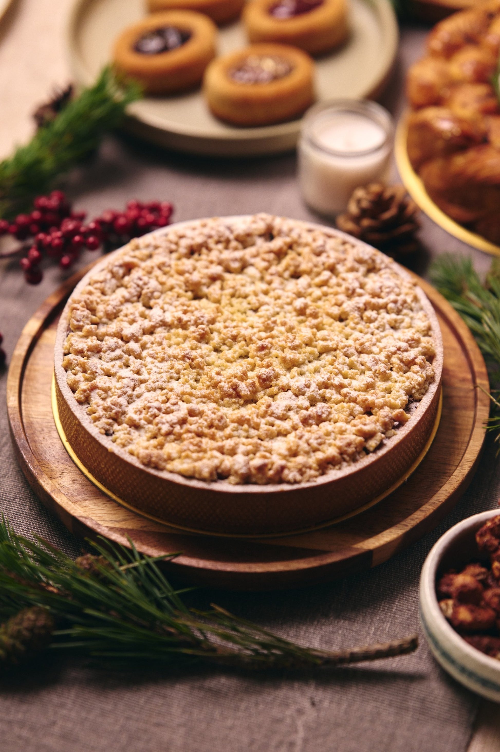 This 8-inch tart combines roasted brown butter almond cream with slow-cooked Granny Smith apples glazed in cinnamon and sultanas, all nestled in a signature almond flour pastry shell and finished with a satisfying crumble topping. Serves 6-8. Dust with icing sugar and pair with vanilla ice cream for an elevated dessert experience. Recently enhanced with 20% more apple filling for greater indulgence.