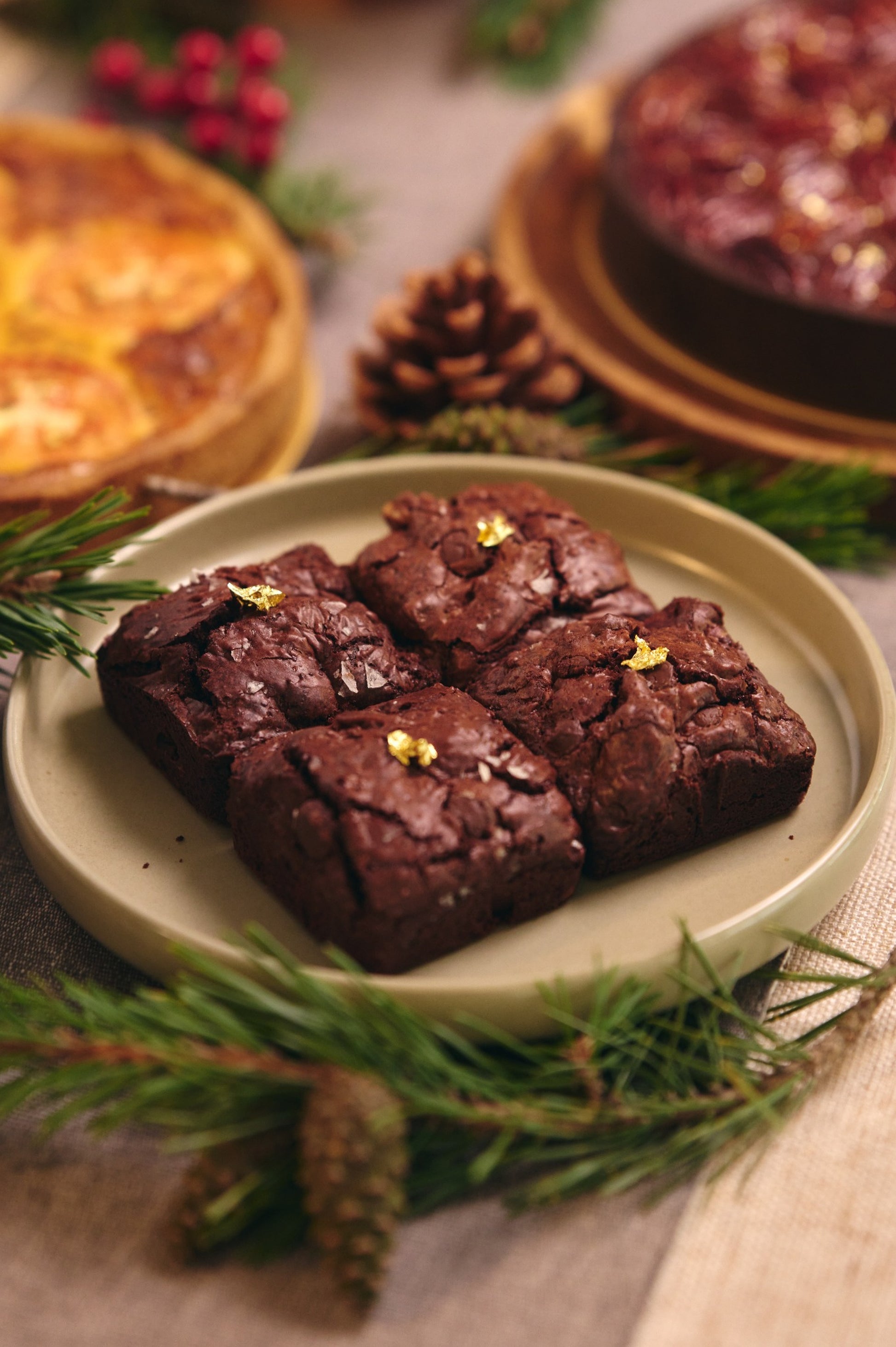 Rich, decadent and addictive, these dark chocolate brownies showcase the complexity of finest Valrhona chocolates in every bite. Each piece is meticulously crafted to deliver an intense cocoa experience, balanced with a subtle sweetness that lingers on the palate. The signature finish of Maldon sea salt cuts through the richness, enhancing the chocolate's natural depth, while delicate edible gold flakes add an elegant touch. This set of nine individually portioned brownies offers the perfect indulgence for chocolate connoisseurs or as an impressive gift for those who appreciate artisanal confectionery. Ideal for pairing with coffee or as a sophisticated dessert finale.
