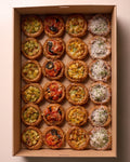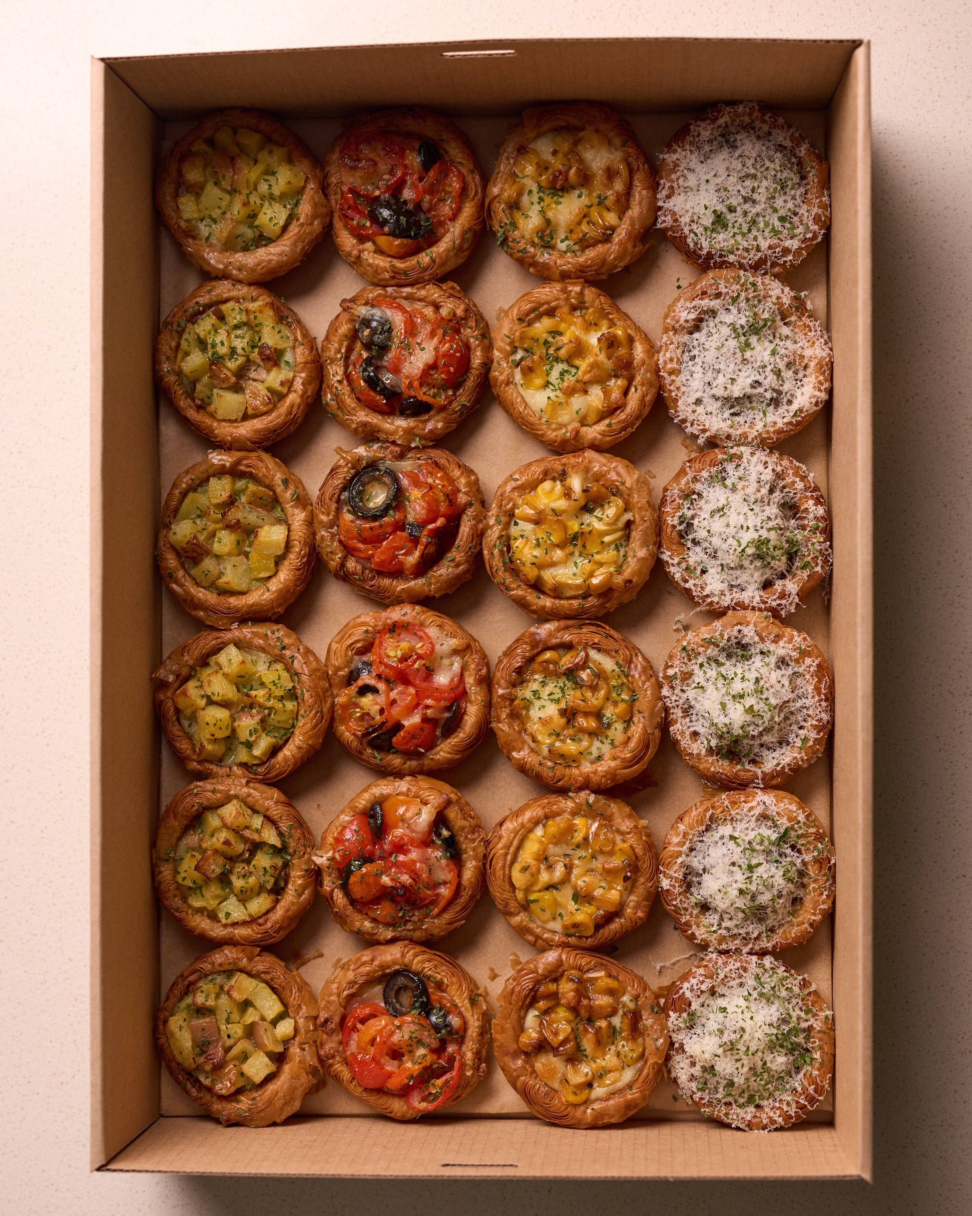 Mini pieces (6cm diameter) of luxuriously flakey savoury danishes, built on our house-made croissant danishes.