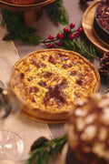 Crafted with a tender, buttery pastry shell, this 8-inch smoked salmon tart delivers layers of sophisticated flavour. The generous filling combines our house-made salmon pâté with creamy cheese and a silken egg custard, creating a luxuriously savoury experience. Each slice offers substantial depth—perfect for discerning palates seeking restaurant-quality fare at home. Serves 6-8, making it an excellent centrepiece for entertaining or indulgent personal enjoyment. We recommend serving alongside a crisp arugula salad to complement the rich, smoky notes with bright, peppery freshness.